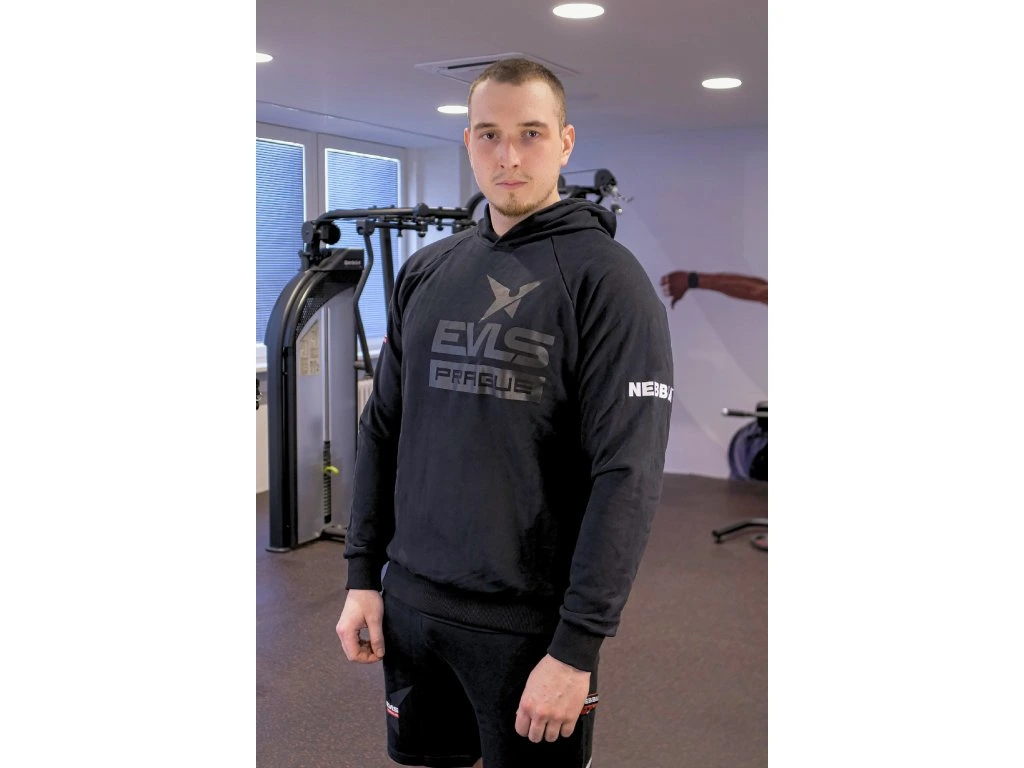 Na přední straně dominuje výrazné logo EVLS Prague, zatímco rukáv doplňuje branding Nebbia, který podtrhuje kvalitu zpracování a spojení se světem fitness.