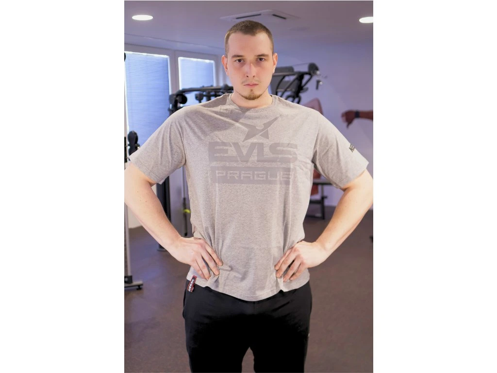 Klasický střih dobře sedí na těle, neomezuje v pohybu a zároveň působí moderně a sportovně. Na přední straně dominuje výrazné logo EVLS Prague, které dodává tričku charakter a odkazuje na jednu z největších fitness událostí v Evropě.